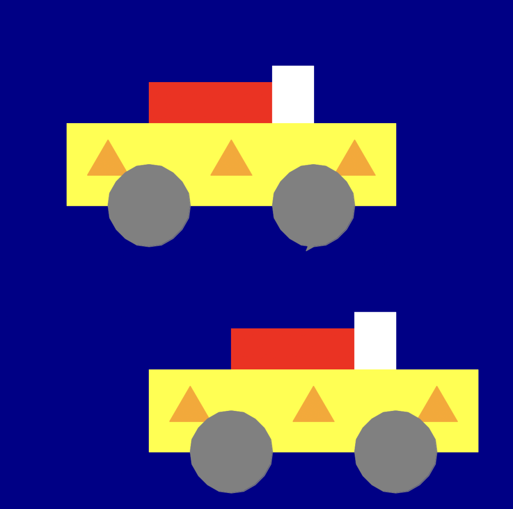 - Copy the rectangle, circle and triangle functions from your previous homework and then add the draw_car(x,y) function. the expected result would be like below