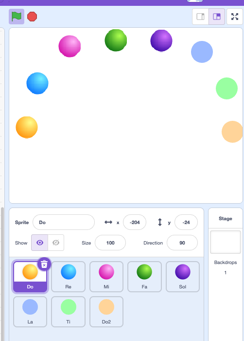 2. Arrange all the notes so you have half circle arrangement from Do sprite in the left most location to all the way to Do2 in the right most location.