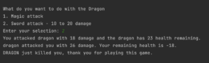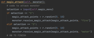 - After this, make it so that the player gets attacked in the magic_attack method of the MonsterSystem class, similar to in the sword_attack() method. Add an else statement to show if the magic attack selection is invalid.
