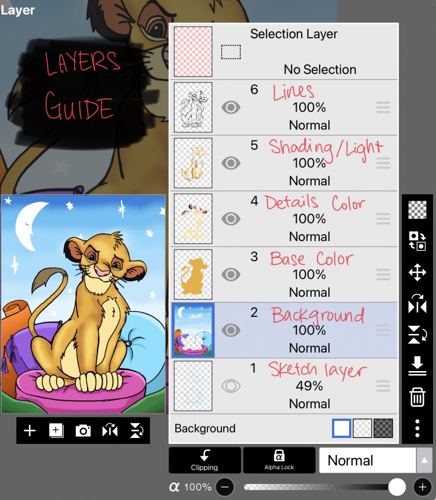 For HW: Add a background to Simba on a new layer. Make sure the new layer for the background is under all the other layers so that your drawing of Simba can be seen on top.