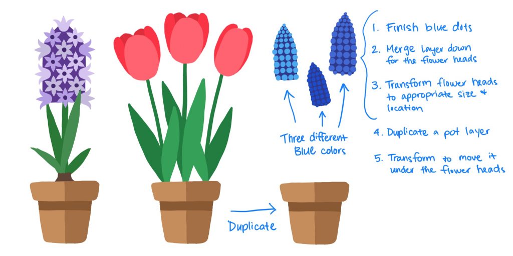 To finish the Muscari flower heads, and transform them into the right size and place. And add the pot for the Muscari flowers. Refer to the images below for a more detailed breakdown of the steps for the homework.