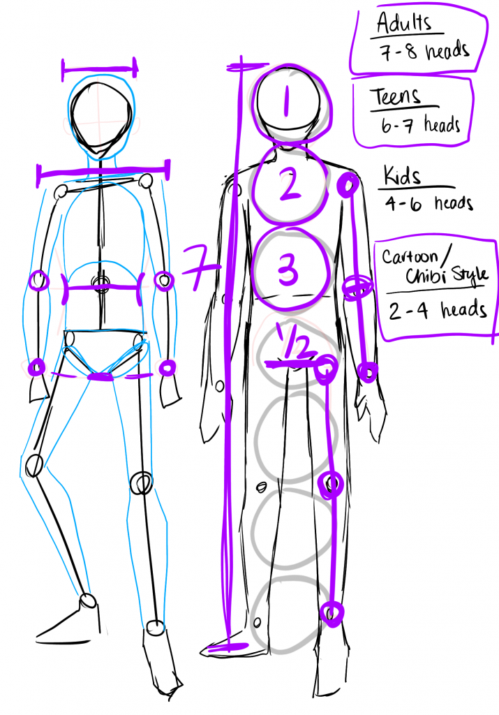- Proportions of body parts to each other (such as elbows are 1/2 down the arm, and right next to the waist usually)