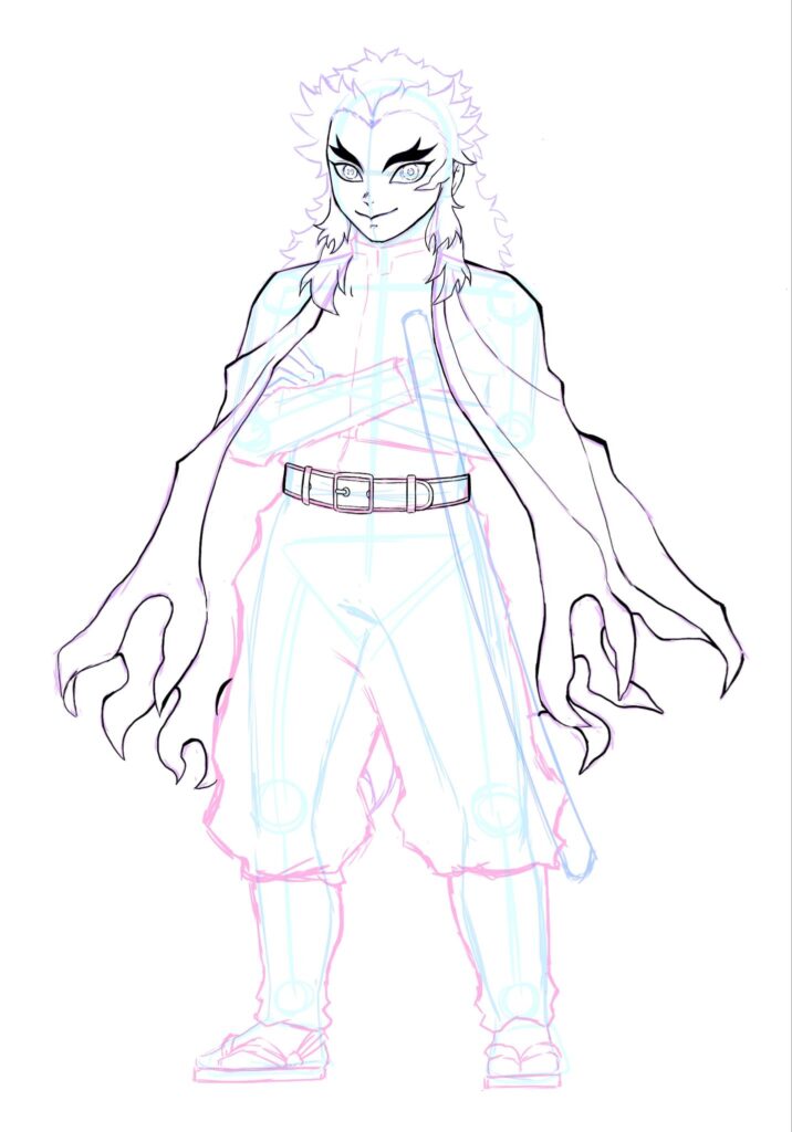 - Drew lines for Rengoku’s face, cloak, belt, and start of the hair. NOTE: Notice the thickness of the lines is different depending on if it is the outside or inside part of the drawing.