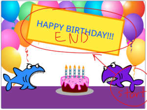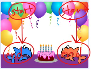 - Changed the background and made the Sharks and Cake sprites show up when they receive the message “Party.”